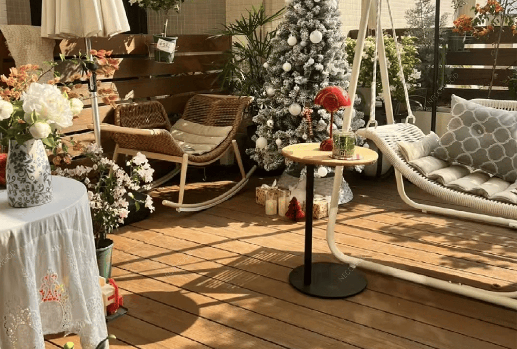 Pelbagai Decking WPC Necowood menawarkan pelbagai corak warna dan tekstur permukaan yang menyerupai kayu semulajadi. Dari nada coklat hangat ke warna kelabu kontemporari, bahan membolehkan kemungkinan reka bentuk yang pelbagai - sangat sesuai untuk pangsapuri moden balkoni kediaman atau lounge luar komersial. Setiap produk menyampaikan rupa semula jadi kayu sambil memberikan ketahanan dan kestabilan bahan komposit.