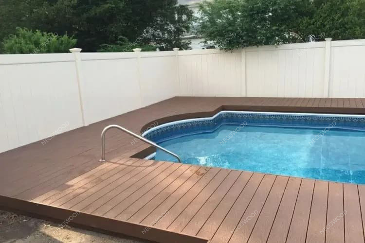 Peralihan ini telah memposisikan dek komposit WPC sebagai pilihan utama untuk kolam renang moden. Dengan menggabungkan serat kayu kitar semula dan plastik berkualiti tinggi, dek WPC memberikan kekuatan tahan lama, penentangan terhadap air dan cahaya UV, dan keselamatan yang lebih baik dengan permukaan anti-slip.