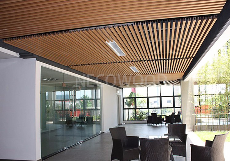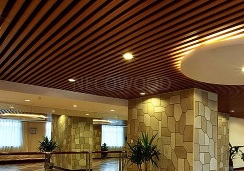 Dibuat dari Komposit Plastik Kayu (WPC)-gabungan gentian kayu semulajadi dan polimer gred tinggi-panel siling necowood menangkap kehangatan dan keindahan kayu sebenar sambil menghapuskan isu-isu seperti perang, retak, atau penyelenggaraan yang kerap.